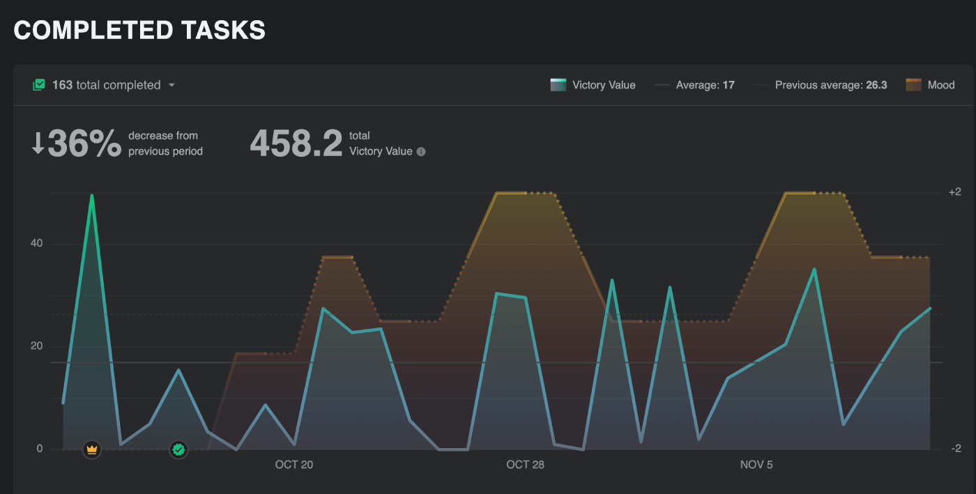 The new "Completed Tasks" dashboard in the web & desktop "Tasks" pane directly plots your average daily mood against your total Victory Value.