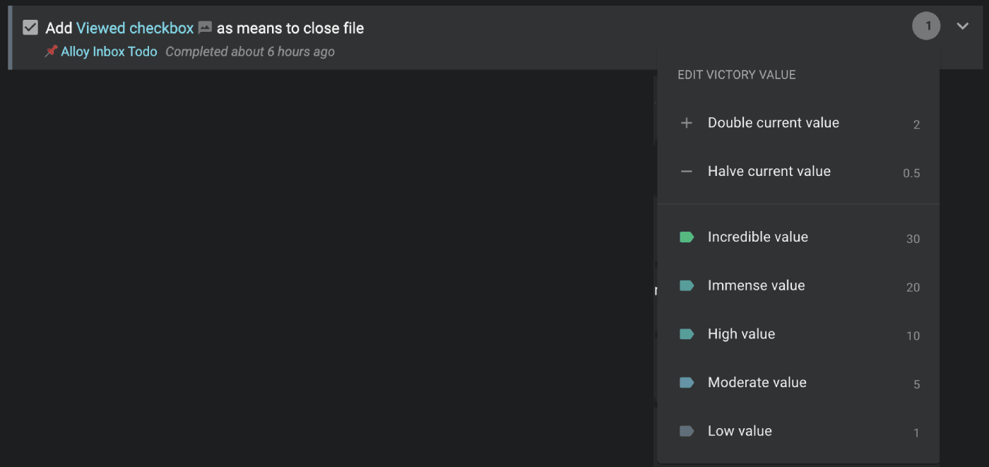 Now, when browsing completed tasks, you can click the right side of any task to manually adjust its Victory Value. This "human-judgement-in-the-loop" approach ensures your analytics become ever-more accurate, to the extent you make time to fine-tune your completed task victories with your post hoc evaluation of how the task's ROI. Better data in, better insights out.