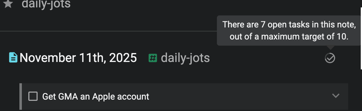 Attention Jots users! We know you live in a world of daily journaling, but that doesn't mean you can't set the boundaries for how much work you are willing to be saddled with. Now, just like in notes, you can now set a max task target for a tag (e.g., daily-jots).