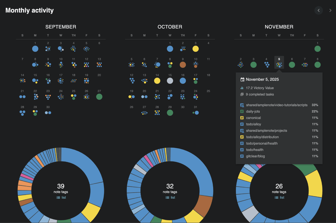 A single week is just data. Zoom out over a quarter, or even a year, and the pattern of your productivity emerges. The "Monthly Activity" on your Completed Stats dashboard allows for true "Quarterly Reviews" or "Annual Reviews" of your life by letting you navigate your completed tasks by month, stretching back through all your history with Amplenote: