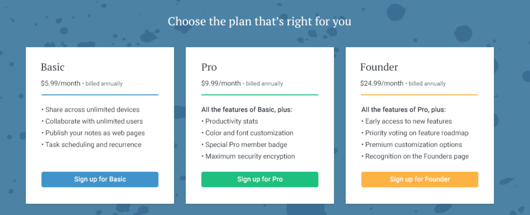 Amplenote offers 3 subscription levels: Basic, Pro and Founder.