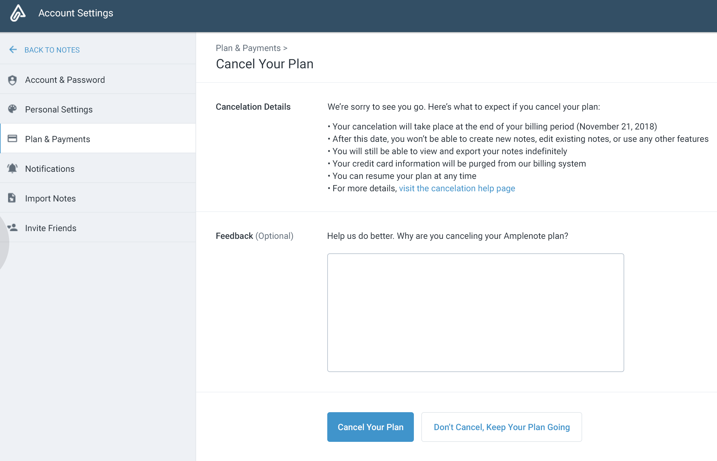 Cancelled accounts can still view and export notes, but don't have access to any other features and cannot create new notes or to-dos.