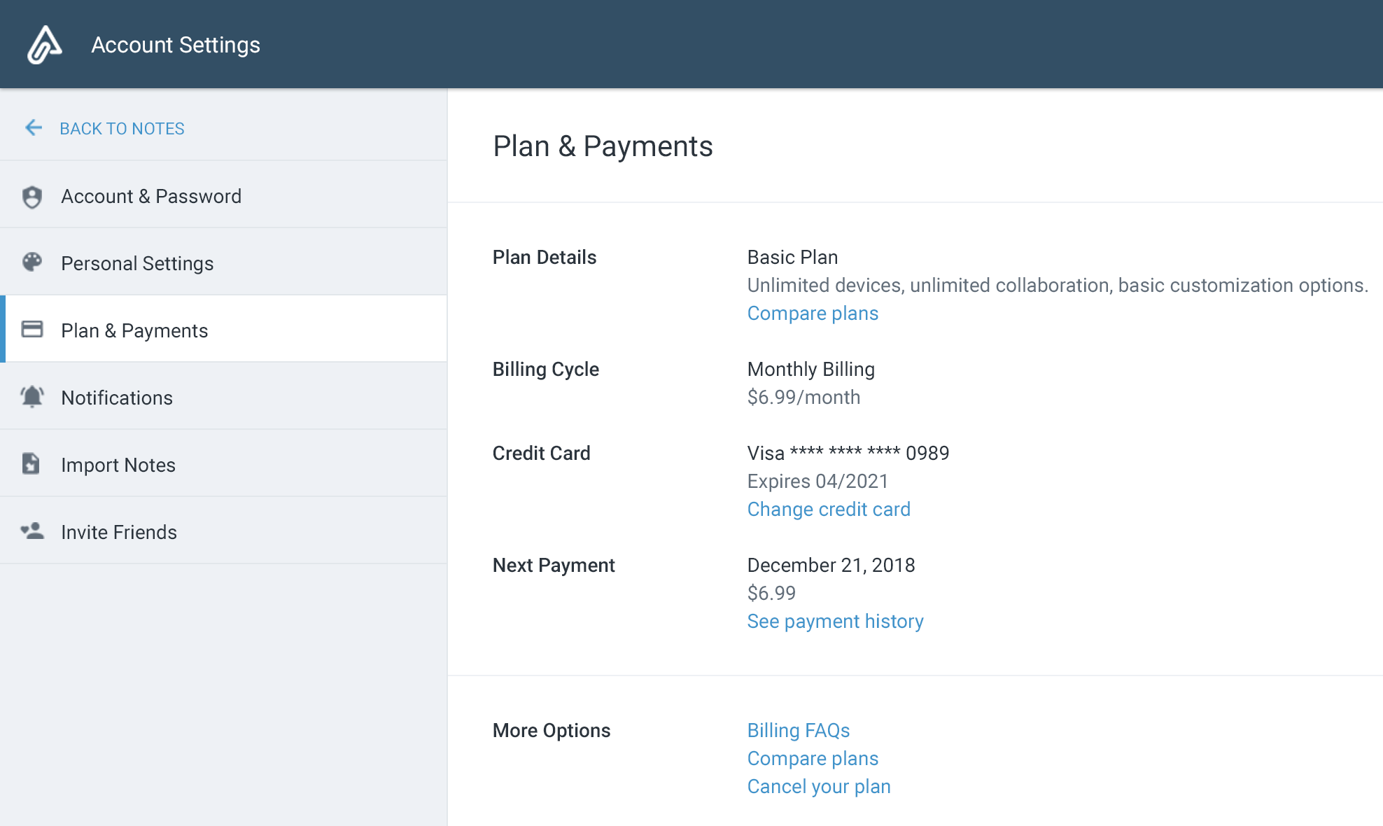 Depending on the billing plan selected at sign-up, you'll be billed once a month or once a year to the card on file. At this time, Amplenote only accepts payments via debit or credit card. You can change your card on file at any time in your Plan & Payment settings. In the event your payment fails or your card expires, you will retain access to your account settings and can view or export existing notes, however you will not be able to create new notes or access other features.