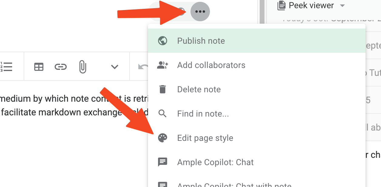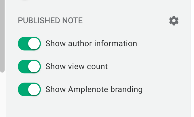 The publish note branding is only shown during the trial subscription period. Once the account has upgraded to become a paying customer, the note style options menu (Publishing notes with background color and image) shows toggles for author information, view count and branding elements: