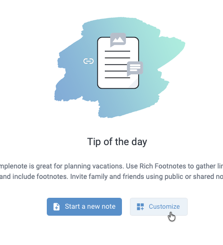 To enable your Amplenote dashboard, first install a plugin that supports dashboards. Then, after clicking on the "Notes" pane, click the button to "Customize" your dashboard area: