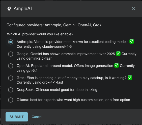 As of 2026, we recommend setting up AmpleAI with multiple AI providers, like OpenAI (ChatGPT), Anthropic (Claude), and Google (Gemini). You can call Add provider API key repeatedly to add keys for multiple providers. Since it seems that a new standard-setting model is released every quarter, it's wise to keep your AI alliances loose.
