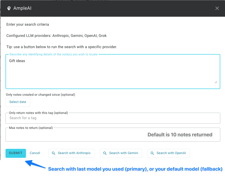 If you don't get the notes you hoped for, you can always try again with a different agent, assuming you have used the Add Provider API key slash menu or "Quick Open" option to add API keys for more than one LLM. They all have distinct ideas about how to decompose your input, so there can be interesting variations when searching on a topic that has many possible matches. Consider returning more than 10 notes if you're trying to undertake deep research on a topic you've written about extensively.
