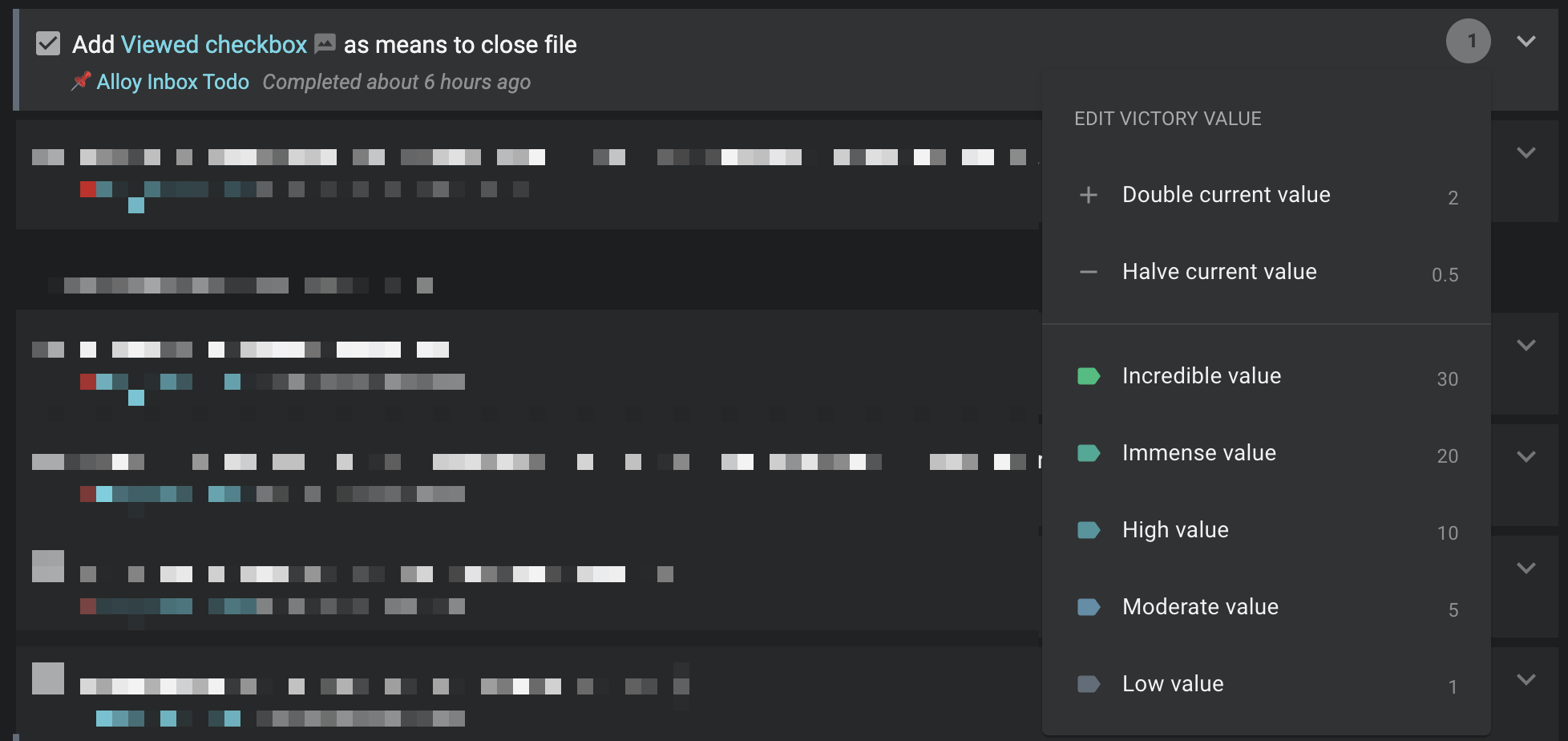 Enter Victory Value, our complement to Task Score, built to help you learn from tasks that are done. If you follow the advice of most all productivity systems to periodically stop and think about your past, Victory Value helps to synthesize: among these 100+ finished tasks, which single choice did the most for my long-term well-being?