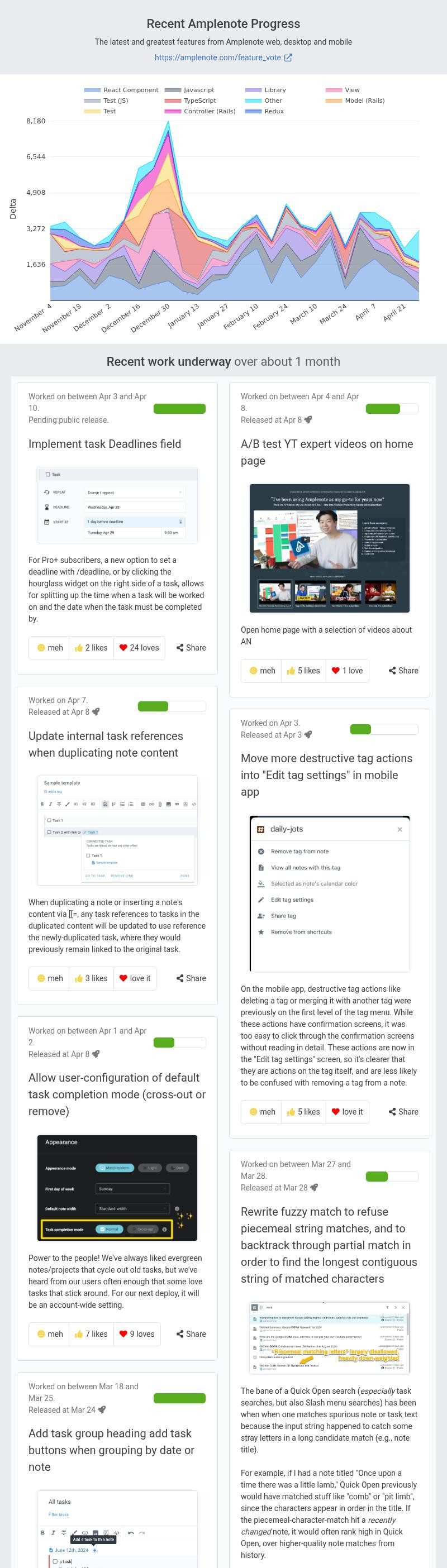 Amplenote's product changelog is automatically generated by interpreting commit activity via GitClear's free Snap Changelog feature ✨.